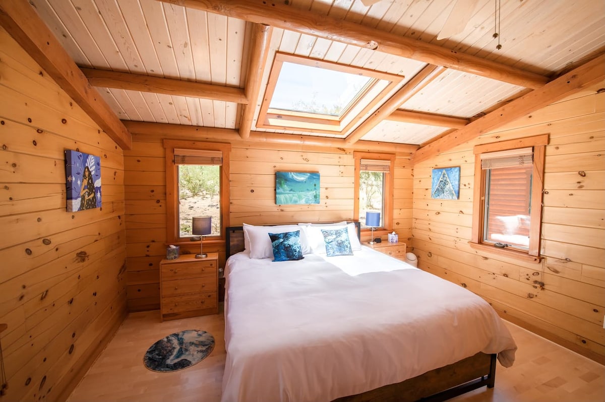 [Mandatory liability waiver signing upon arrival.] This 8-acre haven is not suitable for children under 18 due to the natural terrain, river access, and steep cliffs. NO DOGS (ADA only) Eagle Eye is a cedar sauna converted into a suite, perched atop a limestone cliff overlooking the enchanting creek, offering a unique and immersive experience like no other. With its concave window framing sunrise vistas, guests are treated to a cozy front-row seat to nature's spectacle.. Eagle Eye. 🦅👁️