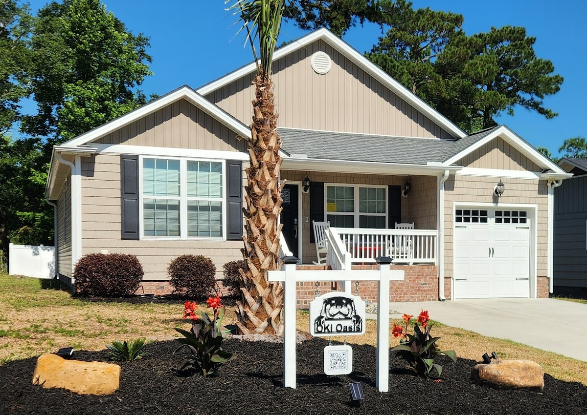 Dog friendly, recently renovated 2 bedroom home (~900 sq ft) - on Oak Island. ~ 0.3 mile to beach. Within walking distance to Publix, donut shop, Middleton Park , tennis courts and eateries. Includes large fenced in yard for fun with family and pet(s) along with outdoor shower. TVs (WiFi w/you tube tv) in living room and both bedrooms . No smoking on premises. Come enjoy the dog days of summer (or any season)! (House is on pilings so must be able to climb stairs)