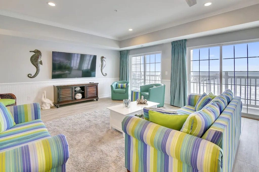 This spectacular ocean view condo with top notch 2022 renovations is just steps from the beach. Be swept away by the view of the rolling waves, whitecaps, and the OKI Pier as you relax and enjoy a beverage on the balcony. You will also be treated to a breathtaking sunset as the colors change each minute across the sky. Retire to the living room and rest your tired feet on a comfy sectional sofa as you interact with others in an aesthetically pleasing open floorplan setting.
