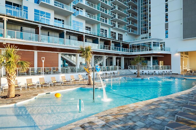 Dear guest, you must be 21 years or older to check in. Discover the charm of Cherry Grove Beach, South Carolina’s top coastal gem, where this sleek, modern resort puts you steps from soft sands and sparkling waves. Spend your days floating down the lazy river or diving into ocean adventures like Jet Skiing and paddleboarding. Catch a sunrise at Cherry Grove Pier, tee off at top golf courses, or comb the beach for seashells and shark teeth.