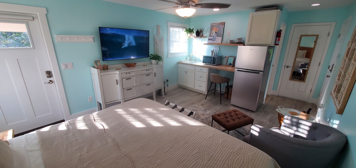 Modern and cozy studio in a quiet, pet-friendly neighborhood. Five minute walk from multiple restaurants and three blocks (10 minute walk) from direct beach access. Enjoy the sounds of birds and ocean breeze while you grill or relax in the covered breezeway. Bring your wood and build a relaxing fire in our beautiful fire pit! This stylish spot has a kitchenette, full bathroom, closet, an amazingly comfortable bed and sofa! The perfect getaway spot for a couple or a few friends!!