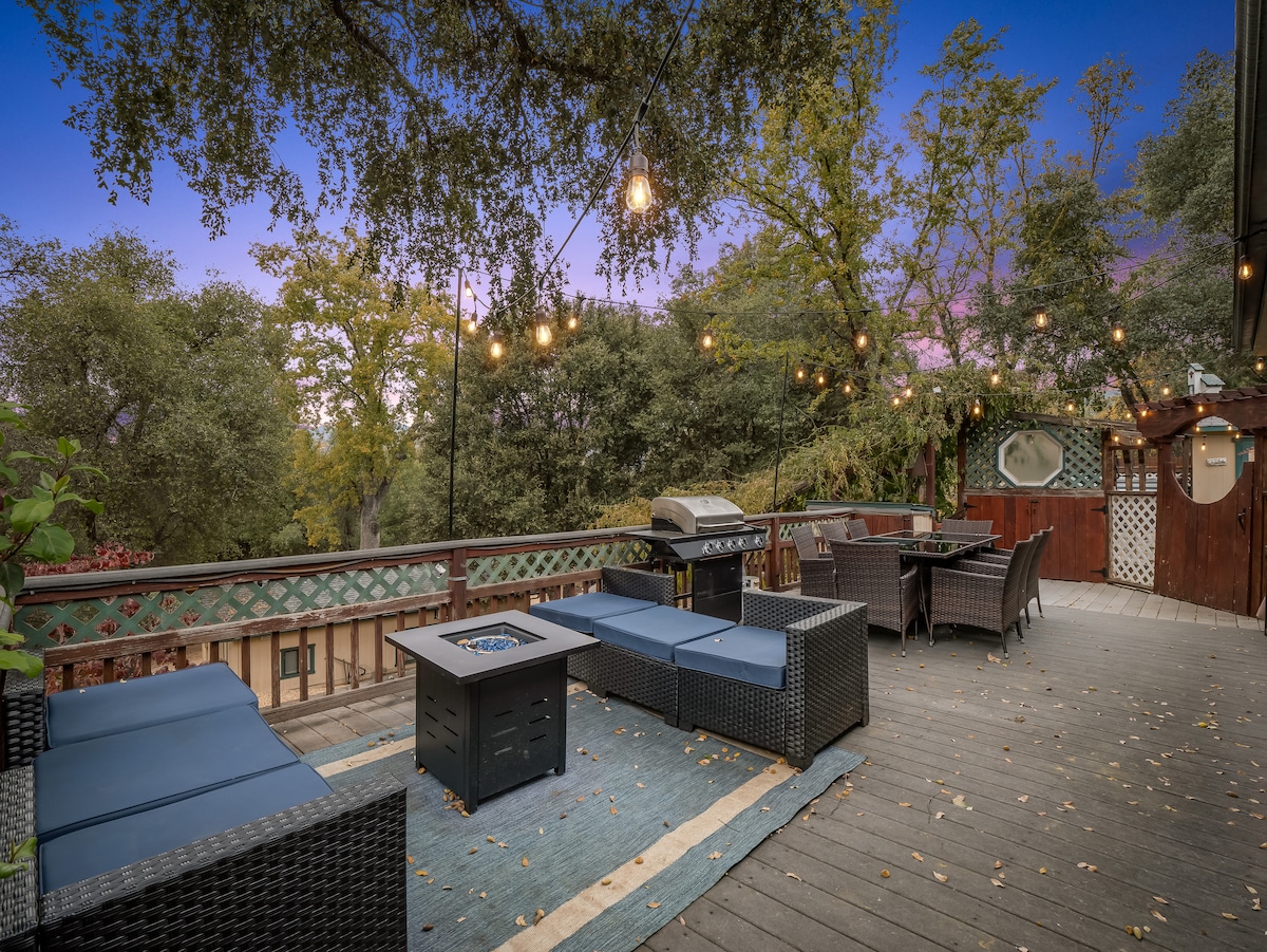 WELCOME to your perfect Mountain Escape LOCATION: 20 minutes to the Yosemite gate and 10 minutes to Bass Lake, this charming mountain home offers a tranquil retreat with beautiful scenery. OUTDOOR AMENITIES: The back patio features a BBQ Area, and a large Hot Tub under a canopy of oak trees with patio lights. The front patio features a PROPANE FIRE PIT with ample seating. INTERIOR: Master bedroom has a CAL King bed with a en-suite shower. 2nd bedroom has a Queen bed.3rd bedroom queen bed