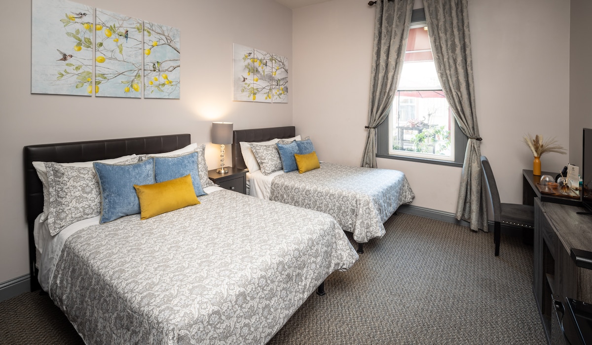 This beautifully appointed room opens into our flower-filled courtyard 🌸 and features two extra-long double beds 🛏️🛏️ (queen-length). Located in a small, family-run motel in the Marina District, near 🏙️ Cow Hollow and Chestnut Street’s shops and restaurants. Enjoy the walkable neighborhood and cozy stay. 🚗 Free parking upon availability—check with the front desk. 🐾 Not pet-friendly. 👥 Max occupancy: 4 guests. We look forward to welcoming you! 😊