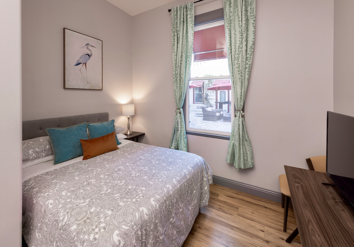 Our Courtyard Queen Ensuite steps out to the outdoor patio and features a queen bed with a private bathroom. This lovely room offers a space to relax with natural lighting from the glass-paneled doors. Additional furnishings include a work station, wardrobe, smart TV, mini fridge, coffee maker, iron, hairdryer, bed linen and towels. This accommodation is perfect for the adventurers looking for a comfortable place to lay your head down after a day of exploring the town.