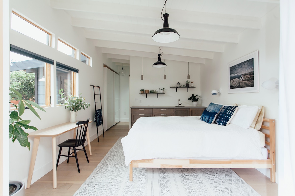 ** FEATURED in Sunset Magazine ** Our bright modern guest house with private access awaits you. Retreat from the city to our comfortable, clean casita. This lovely, light-filled space sits behind our family home, in our garden with fresh berries and lemons. Enjoy morning coffee at the wood farm table. We offer local coffee + tea, a small fridge, robes, wifi, and outdoor dining. Our quiet street is close to BART, 3 blocks from College Ave, full of great restaurants and shops.