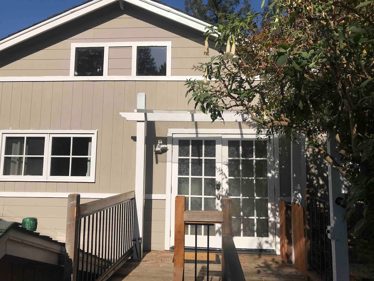 This unique, well equipped, 1 Bed cute little studio (that we love) is detached and fenced off from our main house. It has a separate entrance through a side gate and it's own private rear deck, with a seating and dining area... that overlooks Sausal Creek and Dimond Park. The tall willow that grows along the creek gives the deck the perfect amount of privacy and with the tranquil sound of the creek flowing (not during dry season) you would almost forget you are in an urban city.