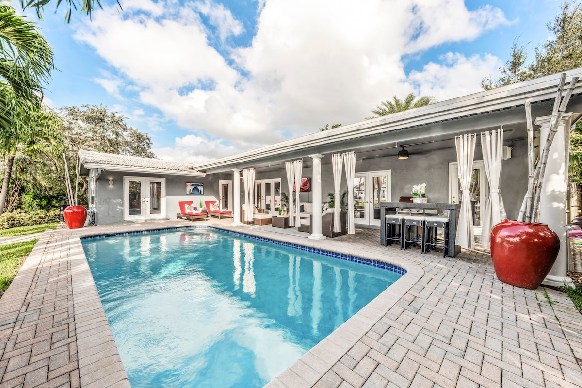 Florida pool home on a canal in captivating Central Corals/Oakland Park. Minutes to Wilton Manors & Lauderdale Beaches. Enjoy light-filled open living spaces, generous bedrooms, and an expansive pool deck with water views. 3 bed/2 baths each room is richly appointed featuring lux linens, vanity, & TVs. The private backyard, large heated pool, sun lounges, outdoor dining & lounge seating, are yours to enjoy. Complete with BBQ & all the pool amenities. Please review house rules prior to booking.