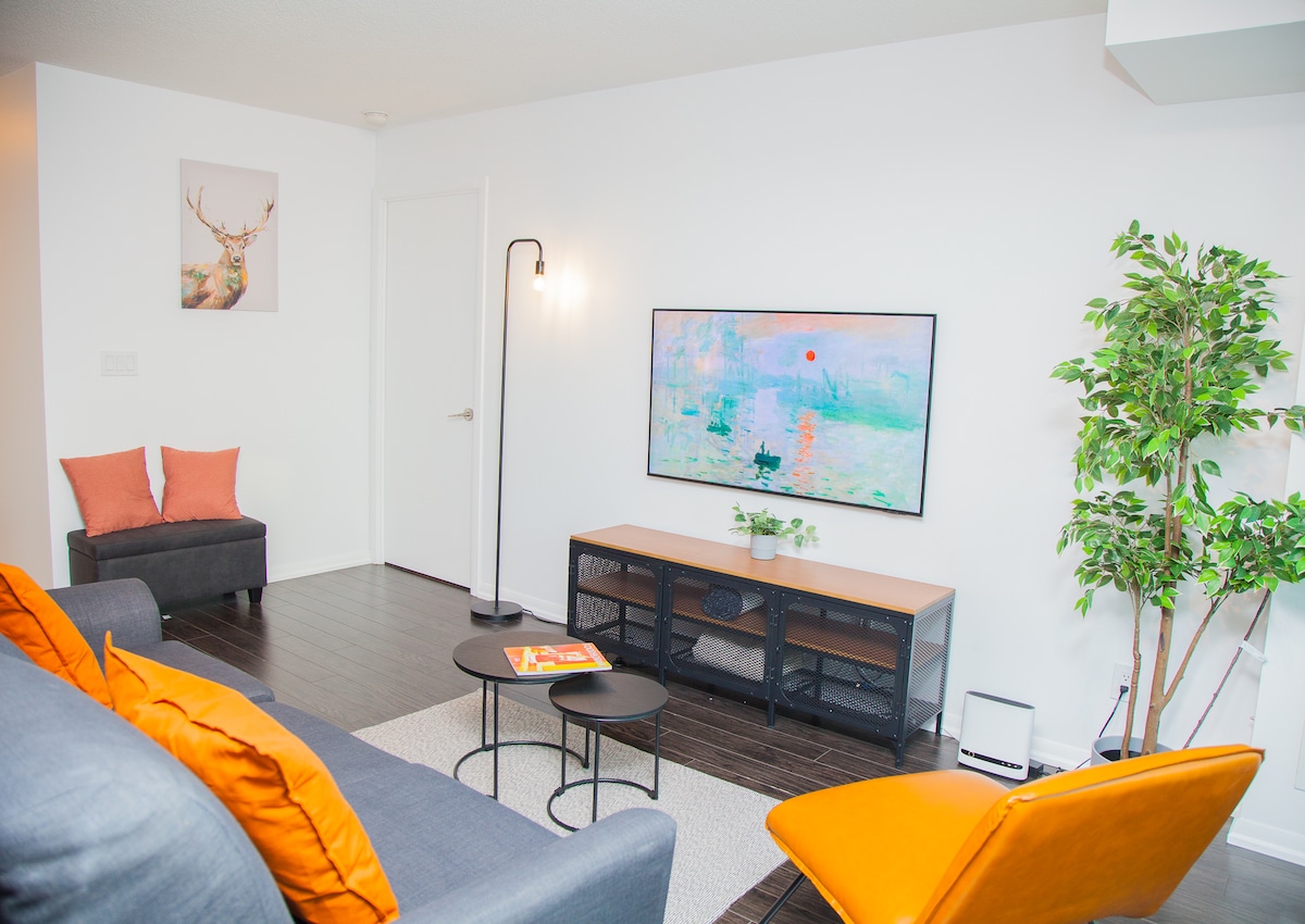 Enjoy a memorable stay at this unique condo located in the heart of Liberty Village. Just steps from downtown Toronto, BMO Stadium, & Budweiser Stage, you’re never far from where you need to go. With beautiful unobstructed park and city views, you can take it all in while you enjoy your little slice of paradise. The condo is designed with warmth, character, and meaning to feel as welcoming and comfortable as possible. You’ll instantly feel at home here. Thank you for thinking of us!