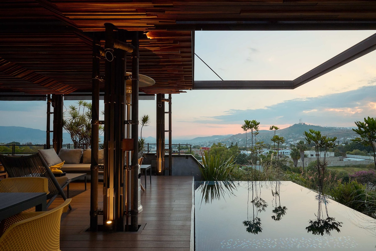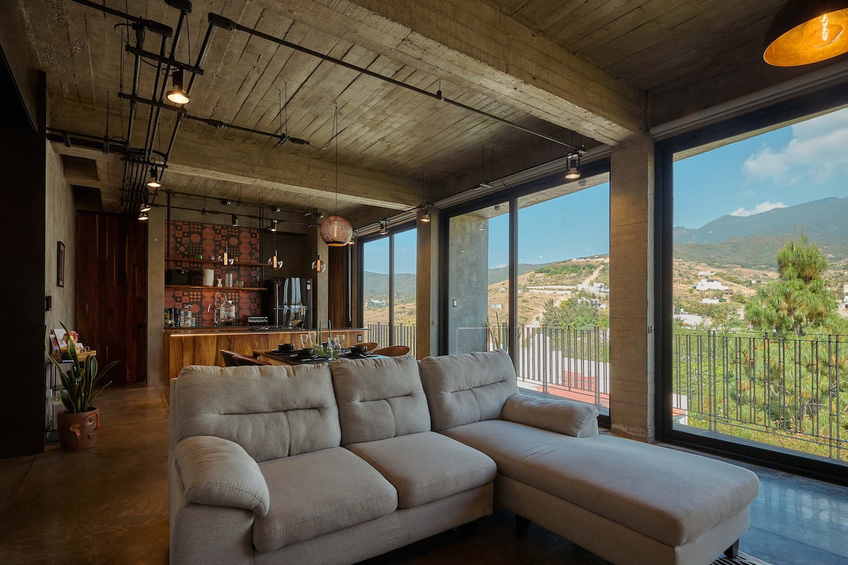 Five minutes walk from the historic center. Close to historical museums and local gastronomy markets, natural lighting and a terrace with a spectacular view of the San Felipe hill (considered the lung of Oaxaca due to its vegetation and clean water). On the ground floor of the building you can taste a local specialty coffee and discover the colorful world of regional textiles. Get ready to live beautiful experiences!