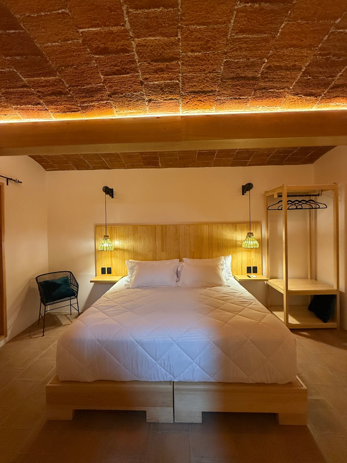 The room, illuminated with natural light, is located in one of the corners of the inn. It is perfect to host the traveller who escapes to enjoy Oaxaca for a few days. - 22m2 - Queen size bed, with bedding made of bamboo. - Private terrace - Boulenc breakfast. - Indoor bathroom with shower. - Handcrafted and organic bathroom amenities made in Mexico. - Free WiFi. - Safety deposit box. - Work desk