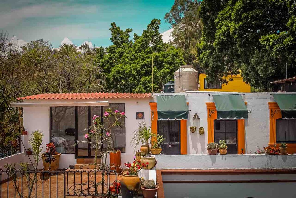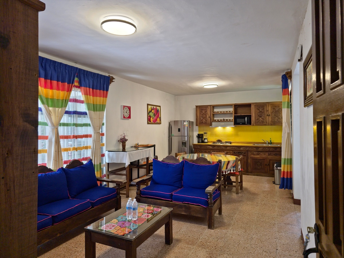 Fully equipped apartment extension of the Hotel La Casona de Tita Oaxaca with two bedrooms: One with a Queen Size bed and access to the patio, dressing room, bathroom and a / c and the other with a Double bed, bathroom and a / c. Fully equipped kitchen, living room and dining room, TV with SKY, WiFi. Parking (garage with automatic door) for 1 medium car or small SUV. Daily cleaning service. Includes Breakfast for 4 people at the Hotel La Casona de Tita facilities.