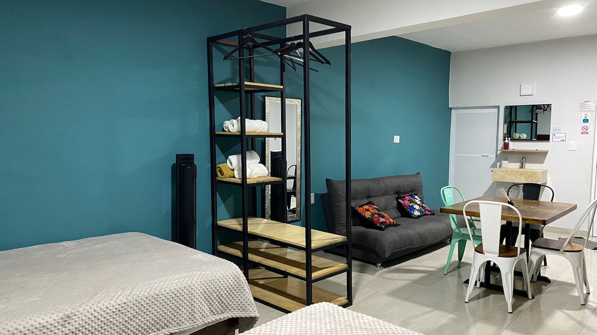 Private room, Loft, with mezanine for rent located only 3 blocks from the Zocalo. It has 2 double bed.. Good wifi. Well equiped kitchen and natural light. It has access to a beautiful patio of the Hostal Luz de Luna. We are located in the heart of Oaxaca, on a busy street, the apartmen can be a little noisy when there is lots of traffic BUT we just installed a double cristal door to disminish the noise.