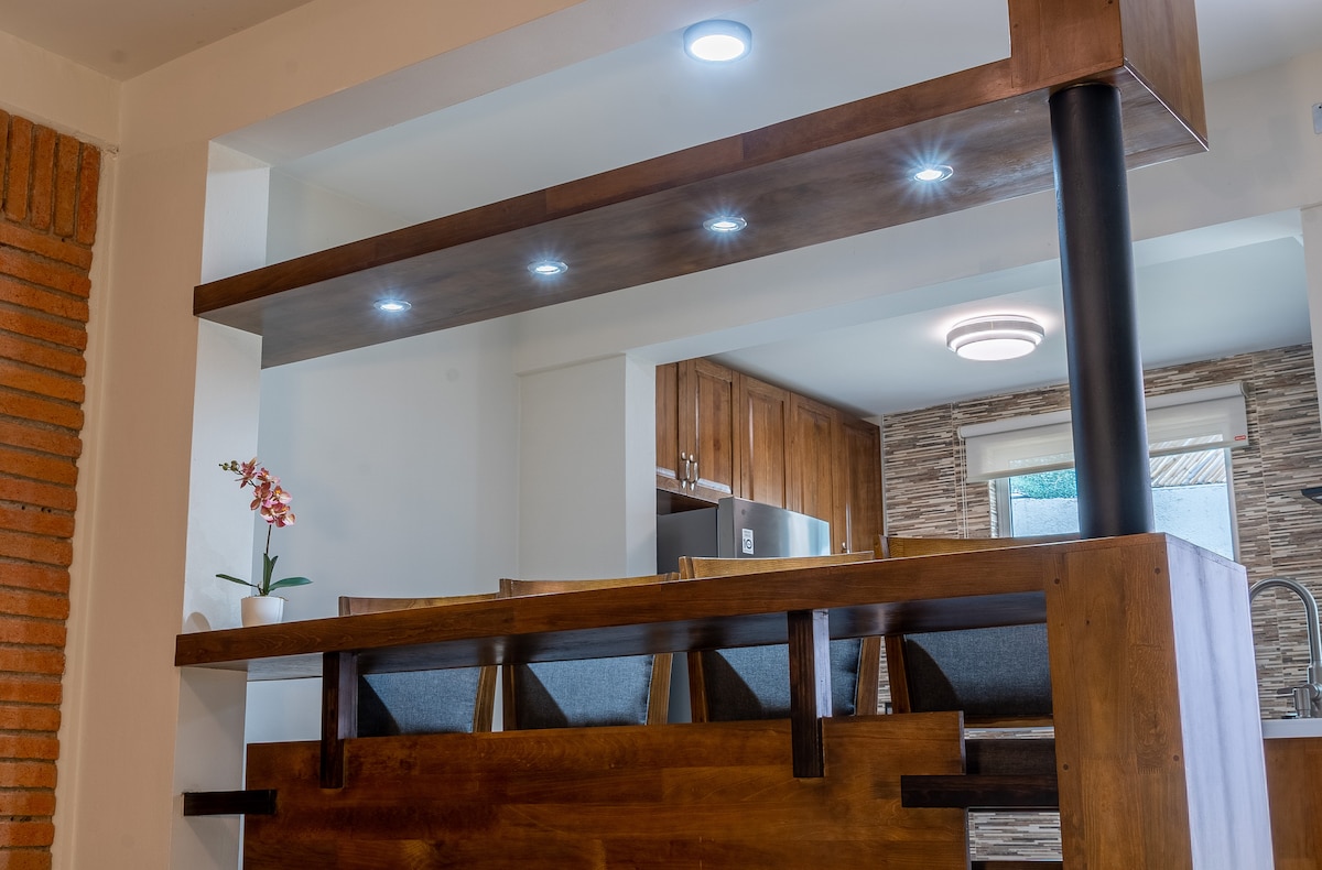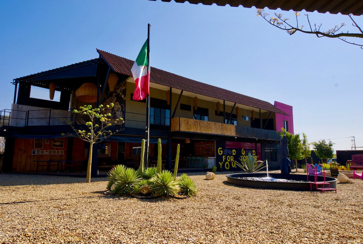 Private room with Queen memory foam bed, full bathroom, desk, A/C, coffee maker, water, Air quality sensor, and mini fridge. Access to rooftops with hot tub, loungers, full kitchen, and amazing views. Air quality monitors in each room ensure maximum comfort and guest safety. In the heart of Xochimilco near cafes, restaurants, and street art.
