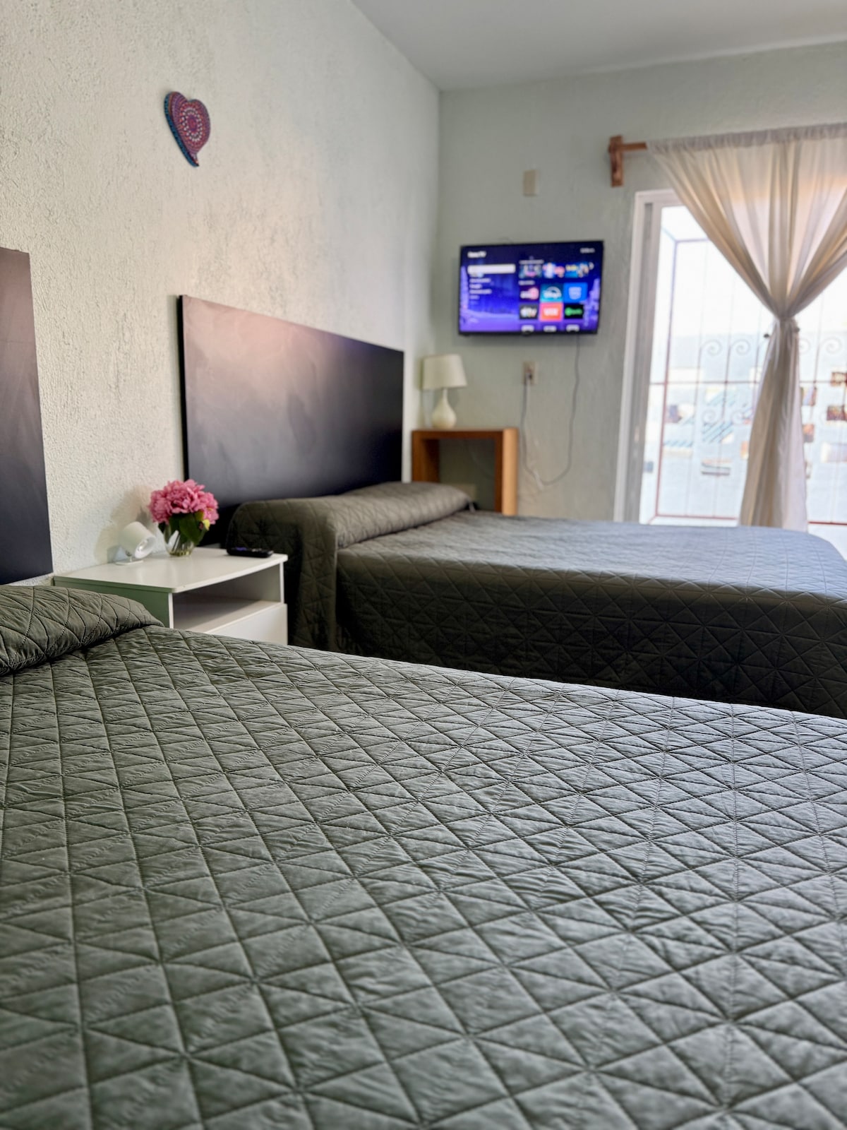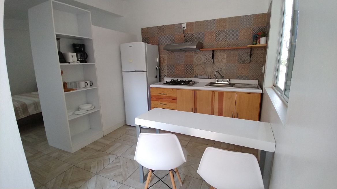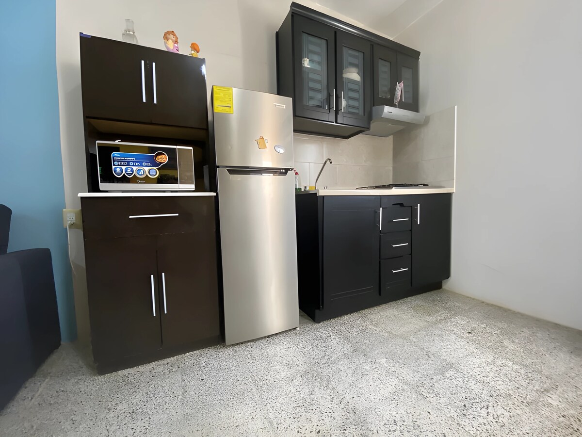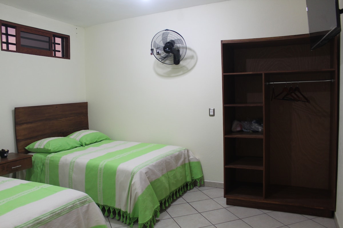 Disfruta de este alojamiento tranquilo, fresco y céntrico, a solo 10 minutos del zócalo de la ciudad caminando. Servicios: Una habitación con cama matrimonial Smart TV, baño completo, cocineta con cafetera y licuadora. Sala con TV por cable, WIFI, cochera para 1 auto, contamos con servicio de agua caliente, gas, utensilios de cocina. Entrada directa a la calle principal, transporte público en la puerta, a una cuadra una tienda de autoservicio.