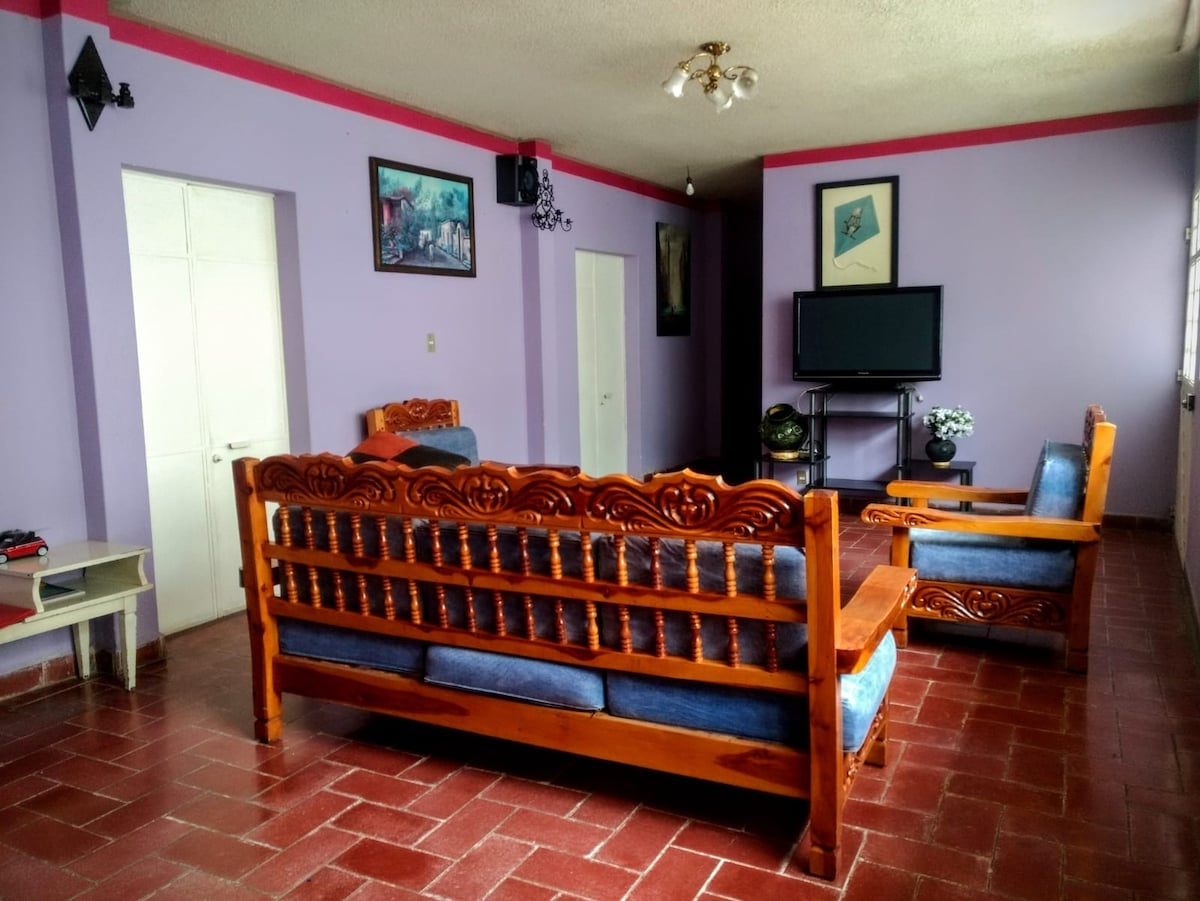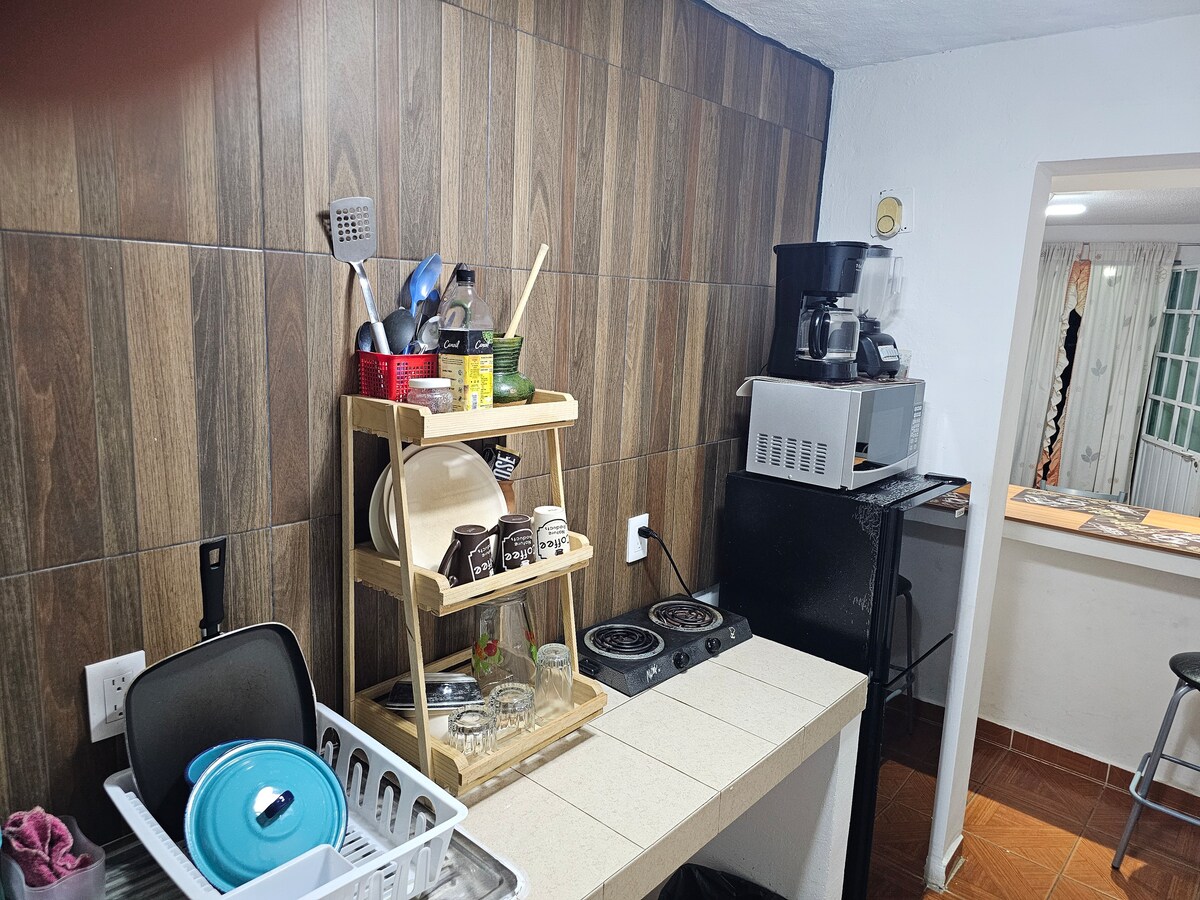 Disfruta de este alojamiento tranquilo, fresco y céntrico, a solo 10 minutos del zócalo de la ciudad caminando. Servicios: Una habitación con cama matrimonial Smart TV, baño completo, cocineta con cafetera y licuadora. Sala con TV por cable, WIFI, cochera para 1 auto, contamos con servicio de agua caliente, gas, utensilios de cocina. Entrada directa a la calle principal, transporte público en la puerta, a una cuadra una tienda de autoservicio.