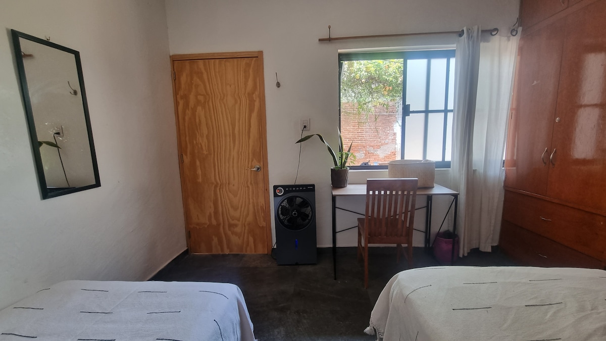 15 minutes walk to zoocalo and touristic street, with kitchen sharing completly, with free water, coffee and tea, sharing spaces, living room, 2 bathroomns with hot wather ilimitated, interior yard, with space for making excercise and yoga, we are in a midle location for take public transportation for mezcal route and another points, we have a markets at 1 minutes, like oxxos o minimarkets. in a safe and local neiborhoods la noria and jalatlaco