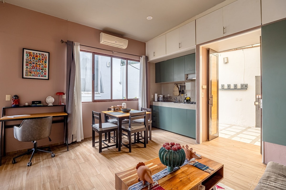 La decoración de la casa es de estilo mexicano moderno está bastante iluminada sus tres habitaciones tienen aire acondicionado esta ubicada en uno de los barrios más representativos y bellos de la ciudad dentro del centro histórico, el barrio de Xochimilco, la zona es muy tranquila a su alrededor encontraras museos , iglesias , tiendas y restaurantes de los más visitados , también está el Mercado tradicional Sanchez Pascuas y “ La cosecha” mercado orgánico a tan solo una cuadra de la casa.