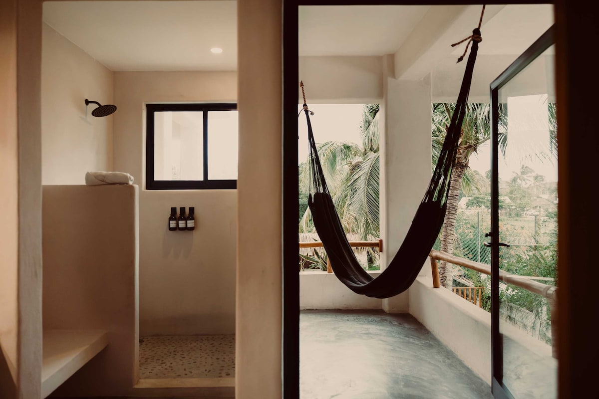 Spacious 103 sqm two-level loft with king bed and garden views plus partial ocean views from upper bedroom balcony. Just 47 steps from Zicatela Beach. Two full bathrooms, fully equipped kitchen, Smart TV. Daily housekeeping included at no cost. Ultra-fast Starlink WiFi. Two pools just steps from your door. Poolside bar access. Ground floor entrance with bedroom on 1st floor. Perfect for couples and solo travelers wanting generous space and comfort in Puerto Escondido's surf capital.