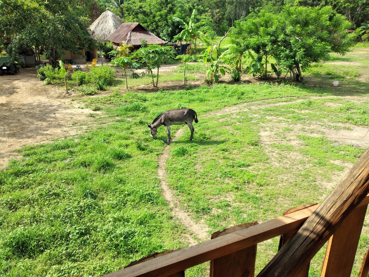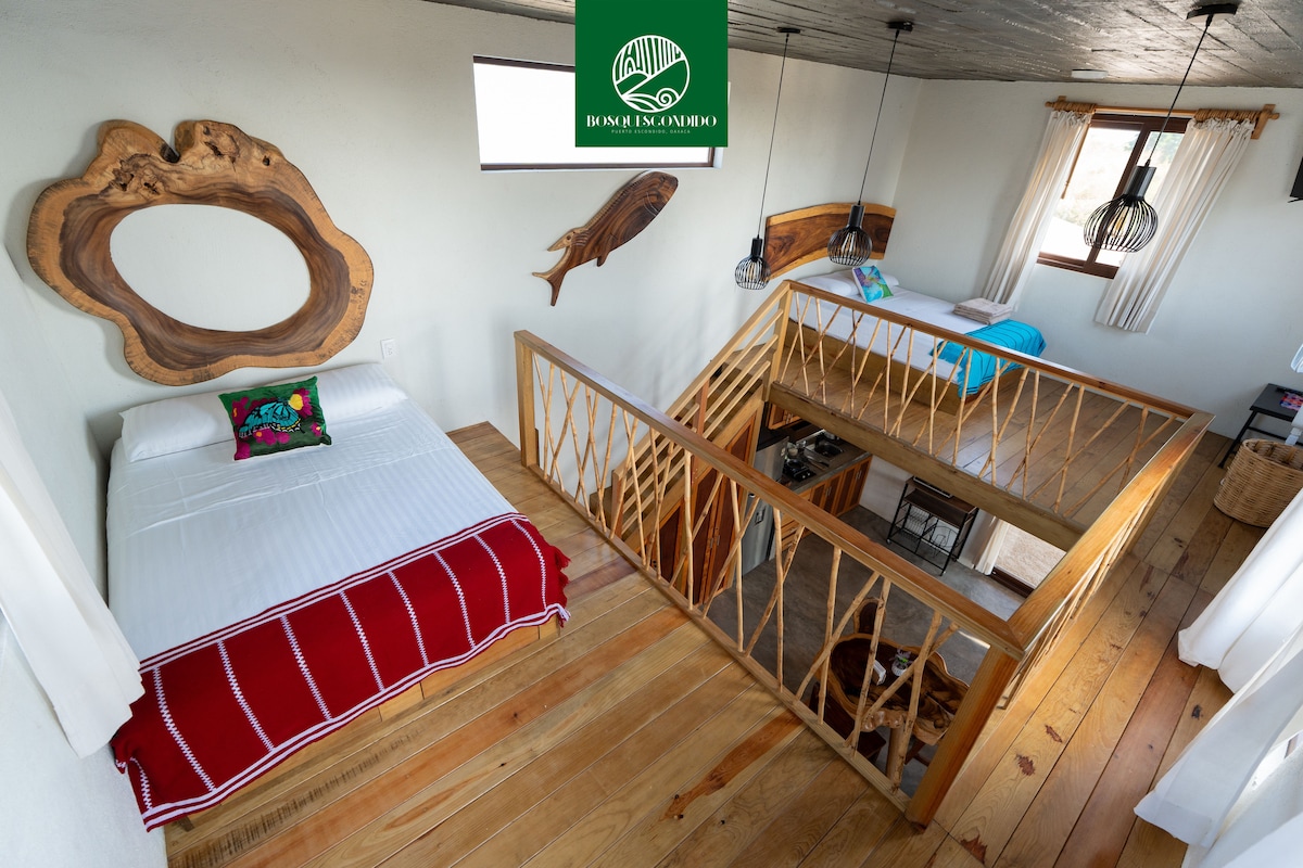 Cabaña estilo Loft con vista al océano, diseño al interior de doble altura con mezanine para las dos camas y privacidad, lo más increíble son las vistas del atardecer, el bosque, por las noches disfrutar de las estrellas y los sonidos naturales del mar por las noches que hace cómodo y agradable el lugar para disfrutar en pareja o familia de una estancia diferente a lo acostumbrado y relajarte rodeado del campo. Baño completo, cocina, comedor, palapa, hamaca, aire acondicionado, tv, WiFi.