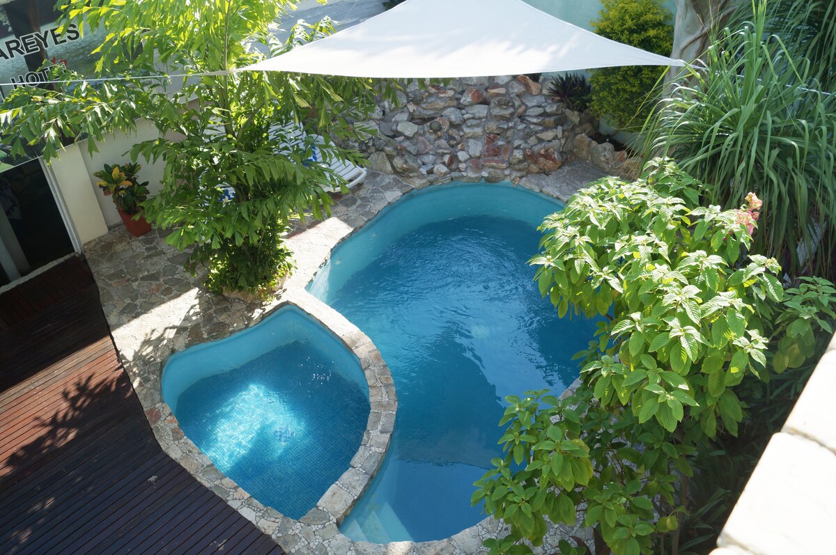 位于市中心的独立房间,配有2张双人床和泳池