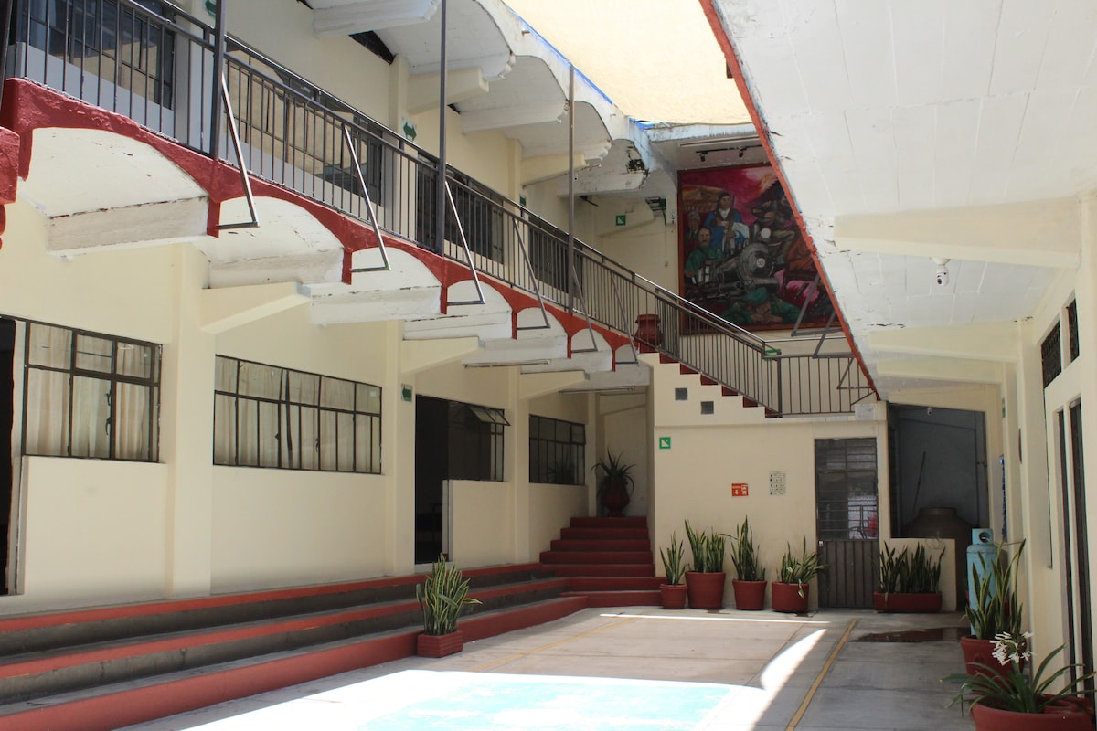 Bienvenido a tu oasis en el corazón de Oaxaca. Tu acogedora habitación en el segundo piso ofrece dos camas matrimoniales para tu comodidad, un baño privado y un balcón privado. Además, tendrás acceso a nuestras áreas compartidas, incluyendo una sala de estar acogedora, una zona de trabajo funcional y una cocina en planta baja. Experimenta la auténtica vida oaxaqueña mientras te sumerges en la riqueza cultural que ofrece esta vibrante ciudad. ¡Tu escapada perfecta comienza aquí!