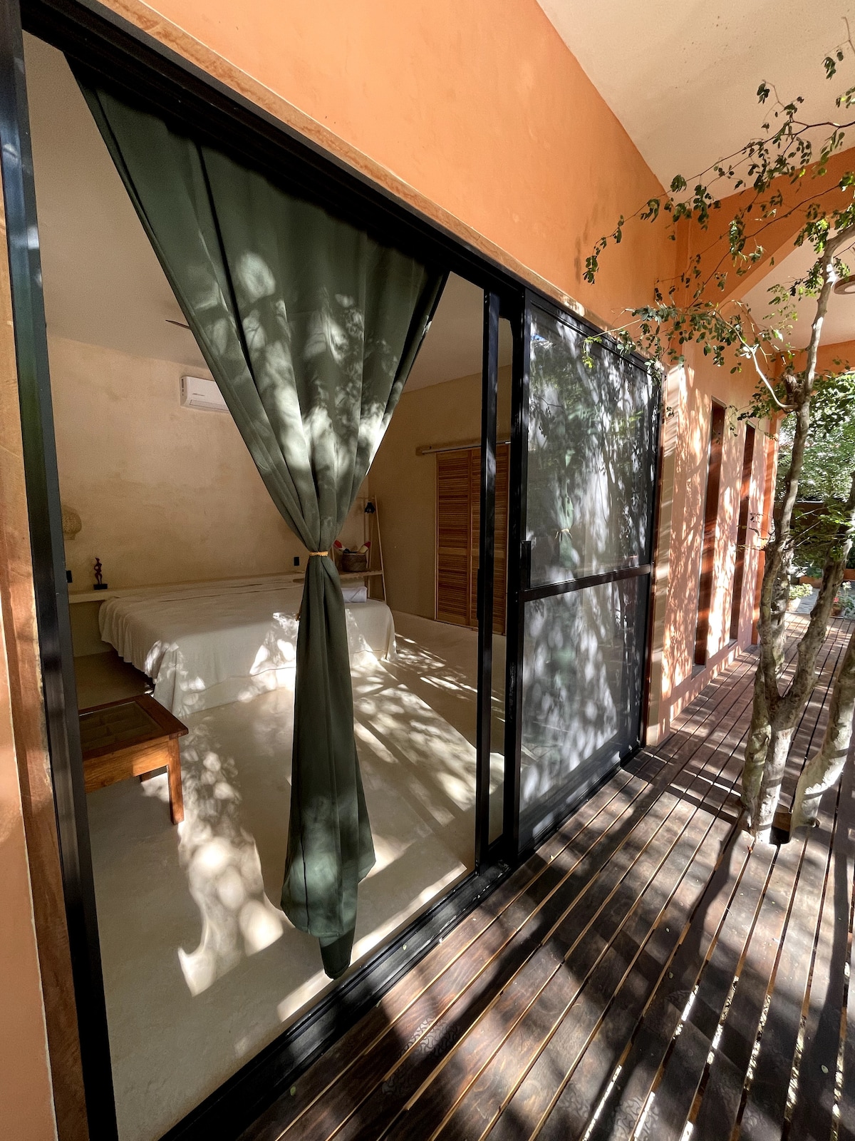 La habitación doble está en planta baja, ofrece un espacio cómodo, fresco y tranquilo, ideal para descansar o trabajar remoto. Su diseño boho-tropical, crea una atmósfera relajante perfecta para una estancia agradable. Cuenta con 2 camas queen size, A/C, ventilador, TV, WiFi, baño privado, frigobar, cafetera Nespresso y barra de cocina. Como huésped podrás disfrutar de las áreas comunes como la alberca, salón de coworking, sala de estar, cocina equipada y circuito de vigilancia.