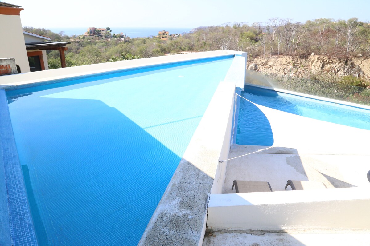 One of a kind panoramic ocean view open living space with 1 bedroom, full kitchen, spacious bathroom, private entry, living and dinning, WIFI, cable. Located in popular Bacocho neighborhood, minutes drive to the airport, 8 min walk to Bacocho beach, 15 min walk to rinconada street where shopping and restaurants are located, 15 min walk distance to Carrizalillo bay. Quite street, with next door swimming pool (included) and hotel amenities. Ideal for romantic getaway.