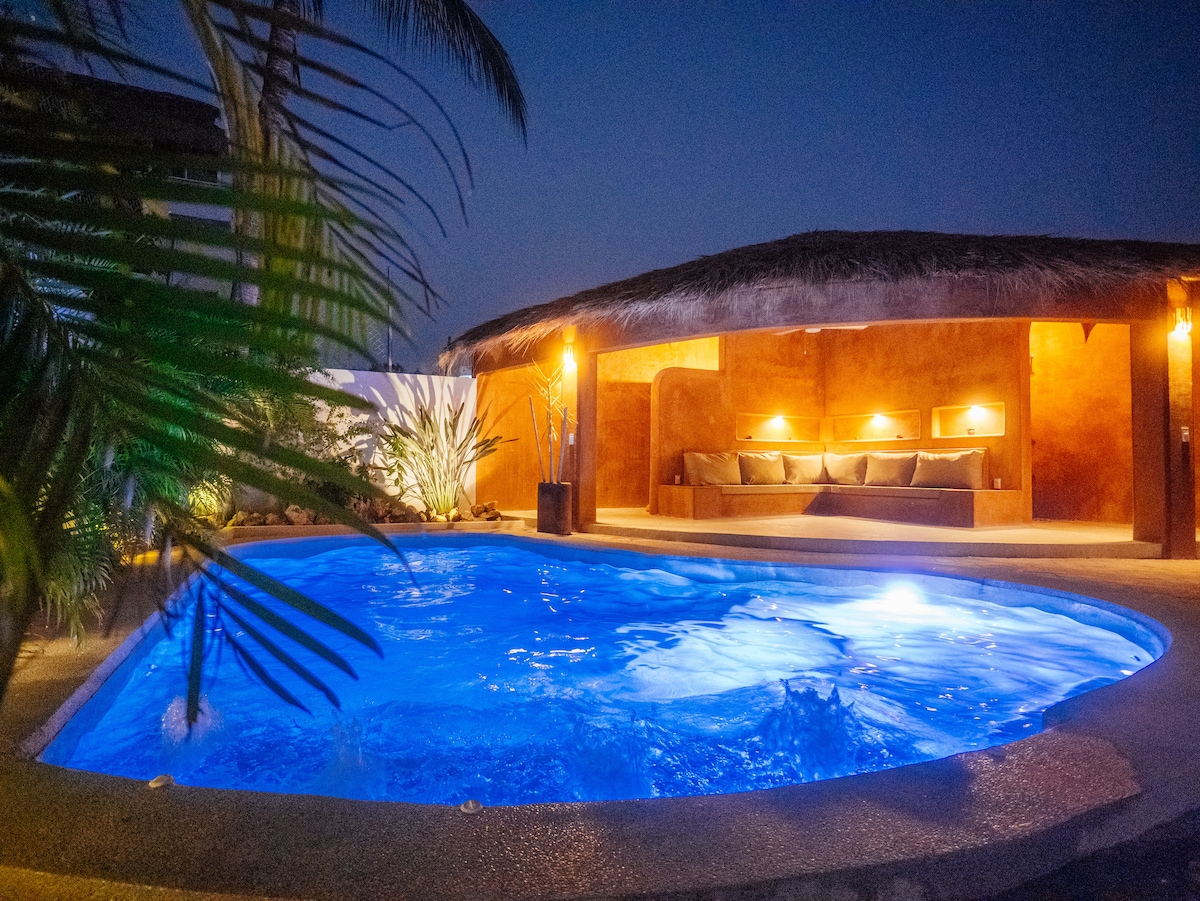 Experience Serenity in our spacious king suite on the 1st floor. Enjoy a cozy king bed with high - quality sheets, a private bathroom, mini fridge & AC. Step onto your patio with hammock, surrounded by plants and embracing pool views. Just 5-min walk to Playa Zicatela and right by the new market. *Cozy king bed, premium sheets *Private bathroom *Refreshing pool, outdoor furniture *Mini fridge *AC *WiFi *TV *Spacious Closet *Relaxing patio with hammock *Embrace local parota wood elegance