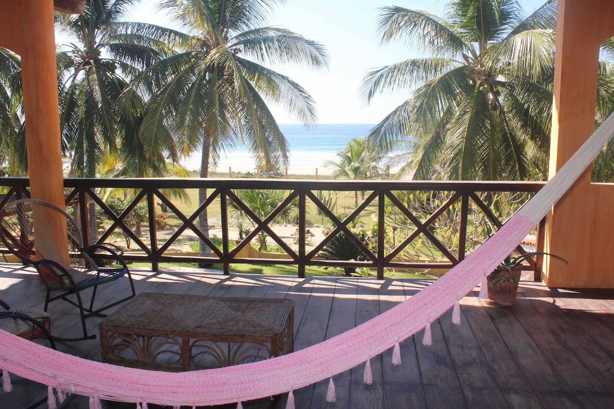 Casa Naia is an affordable beachfront villa located in a private, quiet and prestigious residential area, just a few kilometers outside of Puerto Escondido. Enjoy miles of secluded golden sand beach, relax by the pool, or in one of the many hammocks surrounded by gardens. Enjoy fresh Coconut water from the many coconut trees on the property. Casa Naia is perfect for couples, families (with kids) and bigger groups and retreats.