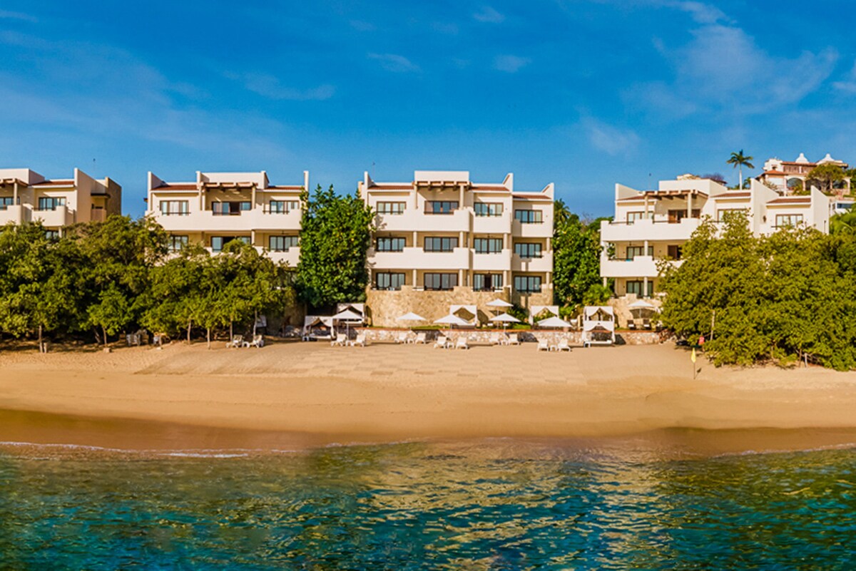Huatulco Celeste Residential Exceptional Accommodation. It offers you a unique rest experience, within a beautiful 5-star resort, located in a private bay in the heart of Huatulco, where you can enjoy amenities such as a spa, restaurant, pool, beach club, and clubhouse with gym, studio yoga, steam, and sauna. Fully equipped residence, 3 bedrooms with services, and high hotel standards. Large terrace facing the sea.