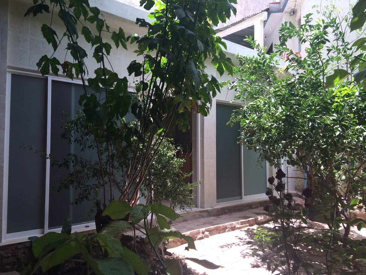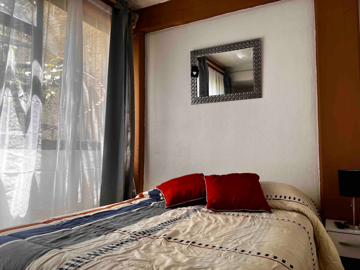 Disfruta de este alojamiento tranquilo, fresco y céntrico, a solo 10 minutos del zócalo de la ciudad caminando. Servicios: Una habitación con cama matrimonial Smart TV, baño completo, cocineta con cafetera y licuadora. Sala con TV por cable, WIFI, cochera para 1 auto, contamos con servicio de agua caliente, gas, utensilios de cocina. Entrada directa a la calle principal, transporte público en la puerta, a una cuadra una tienda de autoservicio.