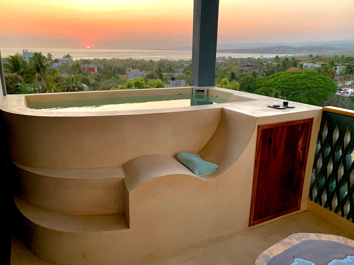 Elegante suite con cama Queensize, Smart TV, Aire acondicionado, ventilador de techo, cocina, baño y jacuzzi privado. Disfrute de los atardeceres y relaje su mente mientras contempla la vista panorámica de la ciudad, el océano y las montañas desde su jacuzzi privado. Nos encontramos en Punta Zicatela, a 7 minutos caminando de la playa, principal punto de surf, restaurantes, bares y zona comercial. Cerca de todo, pero fuera del bullicio de la fiesta. Contamos con Internet Starlink.