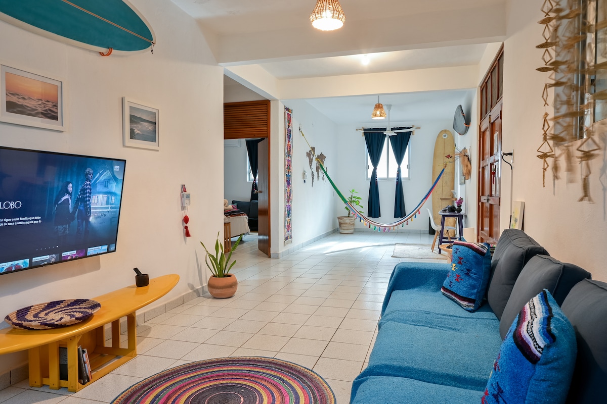 Casa Cuyagua is your perfect hideaway in the best area of La Punta Zicatela—just 100 m from the beach and 50 m from the main street with top restaurants. Spacious, comfy, and full of boho charm. Ideal for surfers, digital nomads, and families. It has 2 bedrooms (1 king & 2 queen beds), a full kitchen, dining area, living room,Tv and access to a large shared patio with hammocks, trees, and BBQ. 🌴🌊 Live like a local.