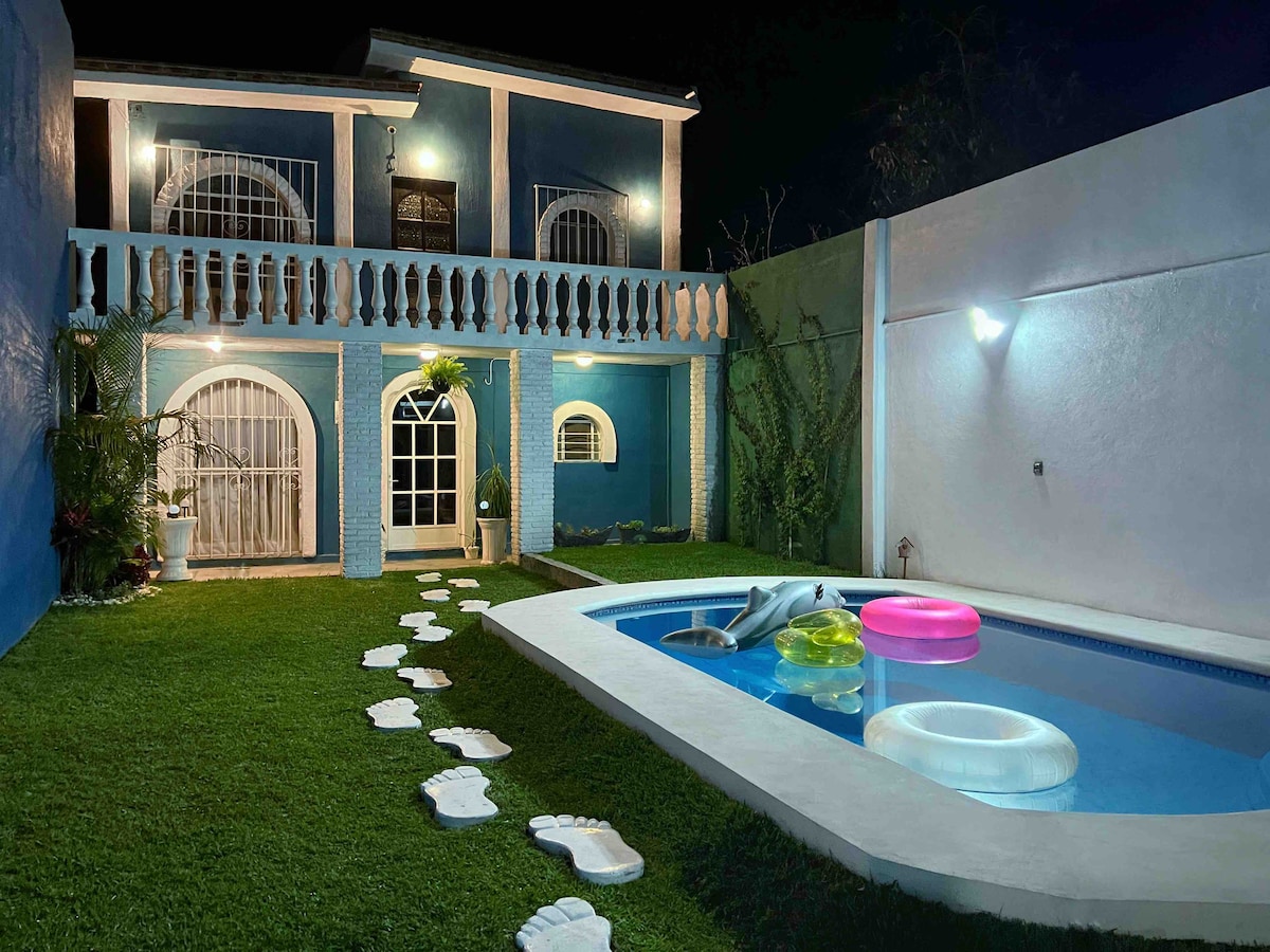Casa GOGA Dentro de un Frac. privado, con vigilancia 24/7, con estacionamiento frente a la casa 100% seguro. Con 600 mts de jardín: mesa de jardín, columpios, alberca y jacuzzi exclusivos para nuestros huéspedes, climatizados con sistema de calefacción solar, sin costo adicional. Roof garden con asador, mesa de jardín y salita para disfrutar una carne asada y una vista espectacular. En su interior: sala-comedor, 3 baños completos, cocina integral y 3 recámaras de buen tamaño. .