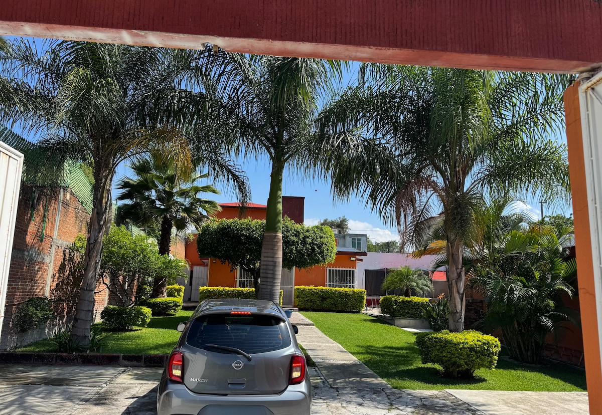 Casa privada dentro del fraccionamiento Los Amates en Oaxtepec, Morelos. Cuenta con hermosas áreas verdes, cancha de fútbol, capilla, explanada, alberca climatizada, baños y vestidores con regaderas. Cocina con refrigerador, estufa, horno, microondas, loza y cubiertos. Habitaciones confortables, comunicadas entre sí, con una TV con servicio de cable. La casa cuenta con red WIFI. Estacionamiento para 2 autos. No hay ruido en la zona. Por cada persona adicional se cobra $300 por noche.