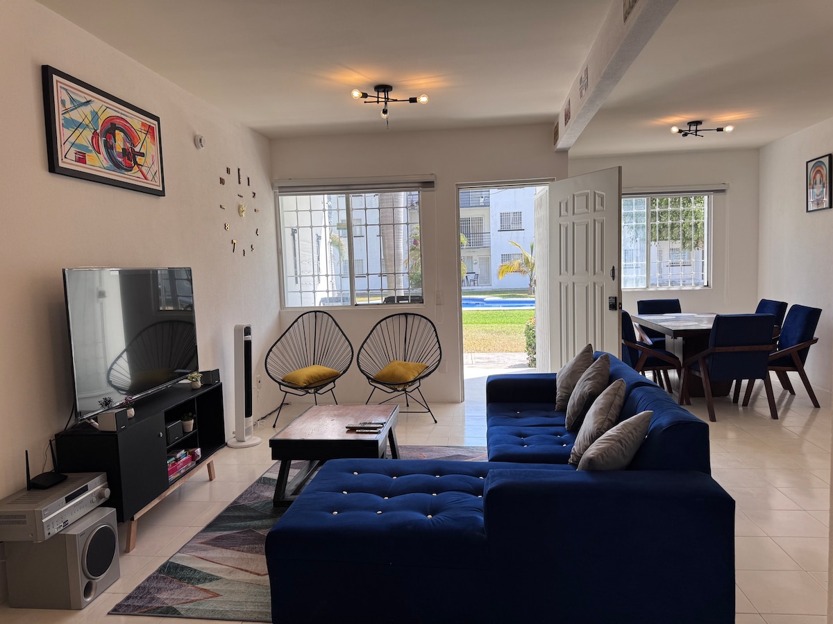 SOLO POR AIRBNB Linda casa en Oaxtepec Morelos, a 5 minutos de Six Flags en fraccionamiento cerrado, vigilancia 24 horas y control de acceso, con todos los servicios, alberca privada, ( caldera opcional ) tres recamaras con 2 camas matrimoniales cada una, estacionamiento para 3 coches dentro del fraccionamiento, palapa con asador, WI FI y pantalla Smart tv, cocina equipada, cerca de Tlayacapan y Tepozlan. aceptamos mascotas Horario flexible puedes llegar a partir de las 9 hr y salir a las 17hr