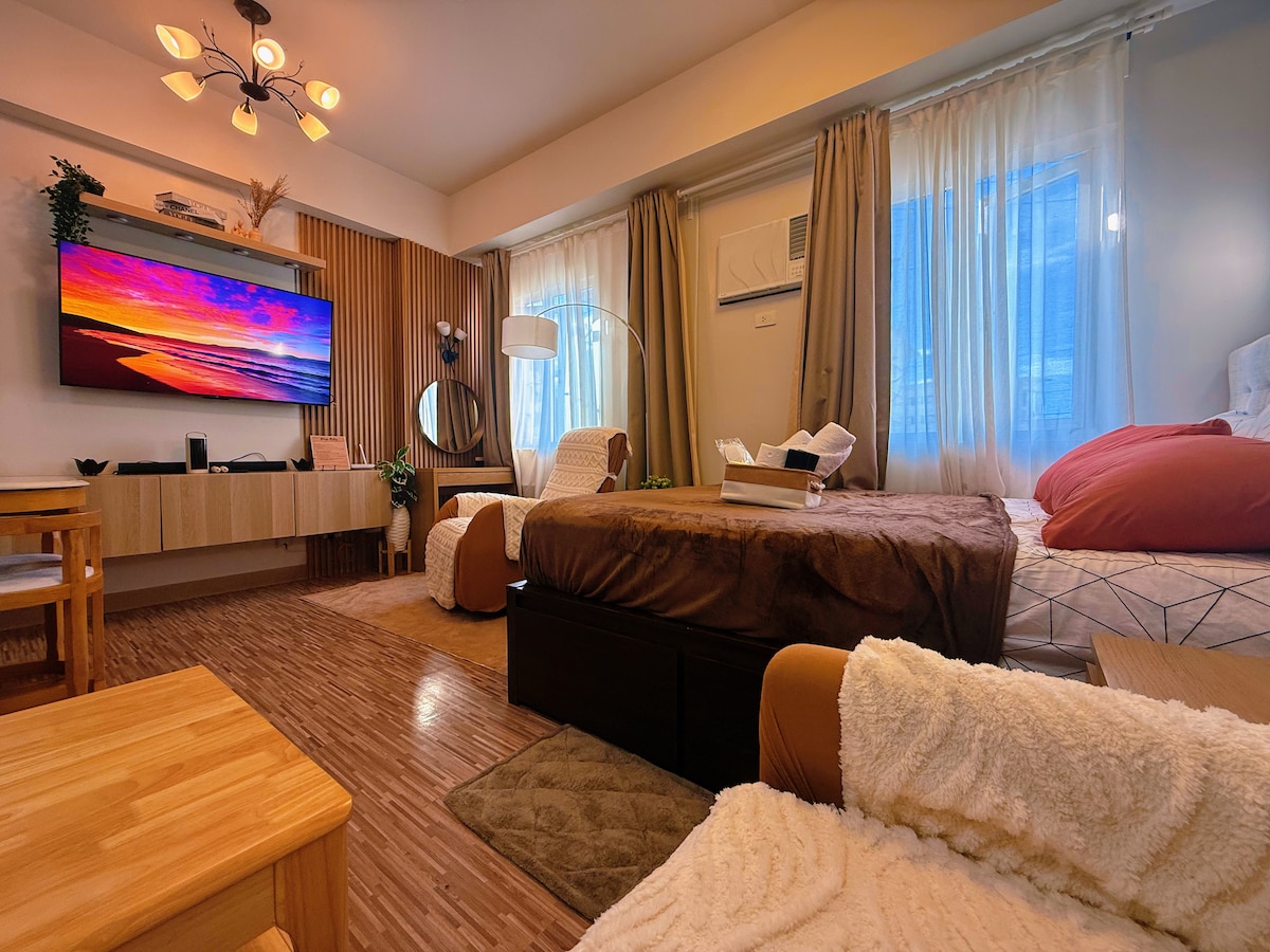 A cozy and comfortable studio unit located in the heart of SMDC Cheer Residences in Marilao, Bulacan! Our unit is fully furnished and equipped with everything you need for a comfortable and enjoyable stay, including a comfortable queen-sized bed, a sofa bed, a flat-screen TV, a dining table, a kitchenette with a refrigerator, microwave, electric kettle, and basic kitchenware, a private bathroom with a hot and cold shower, swimming pool, a 24-hour security and reception desk.
