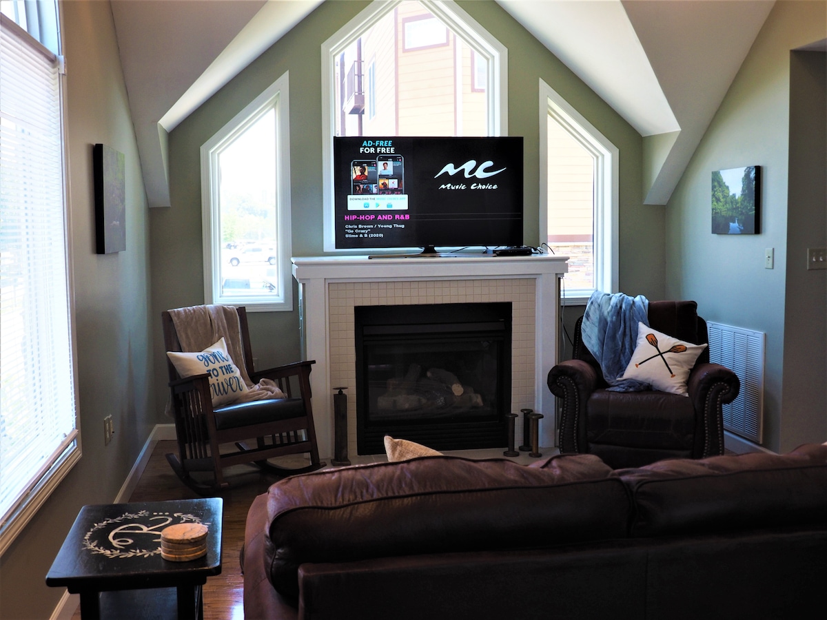 Escape to our luxury mountain chalet, where Smoky Mountain views and modern comfort await! Relax by the unique 3-sided fireplace, unwind in the living area with a 65” smart TV, or soak in the hot tub with panoramic mountain views. The gourmet kitchen with stainless appliances, espresso machine, and dining for 8 makes every meal memorable. Enjoy a game room with pool, multicades and even a rock climbing wall. The master bedroom features a tub by the window, offering breathtaking mountain views.