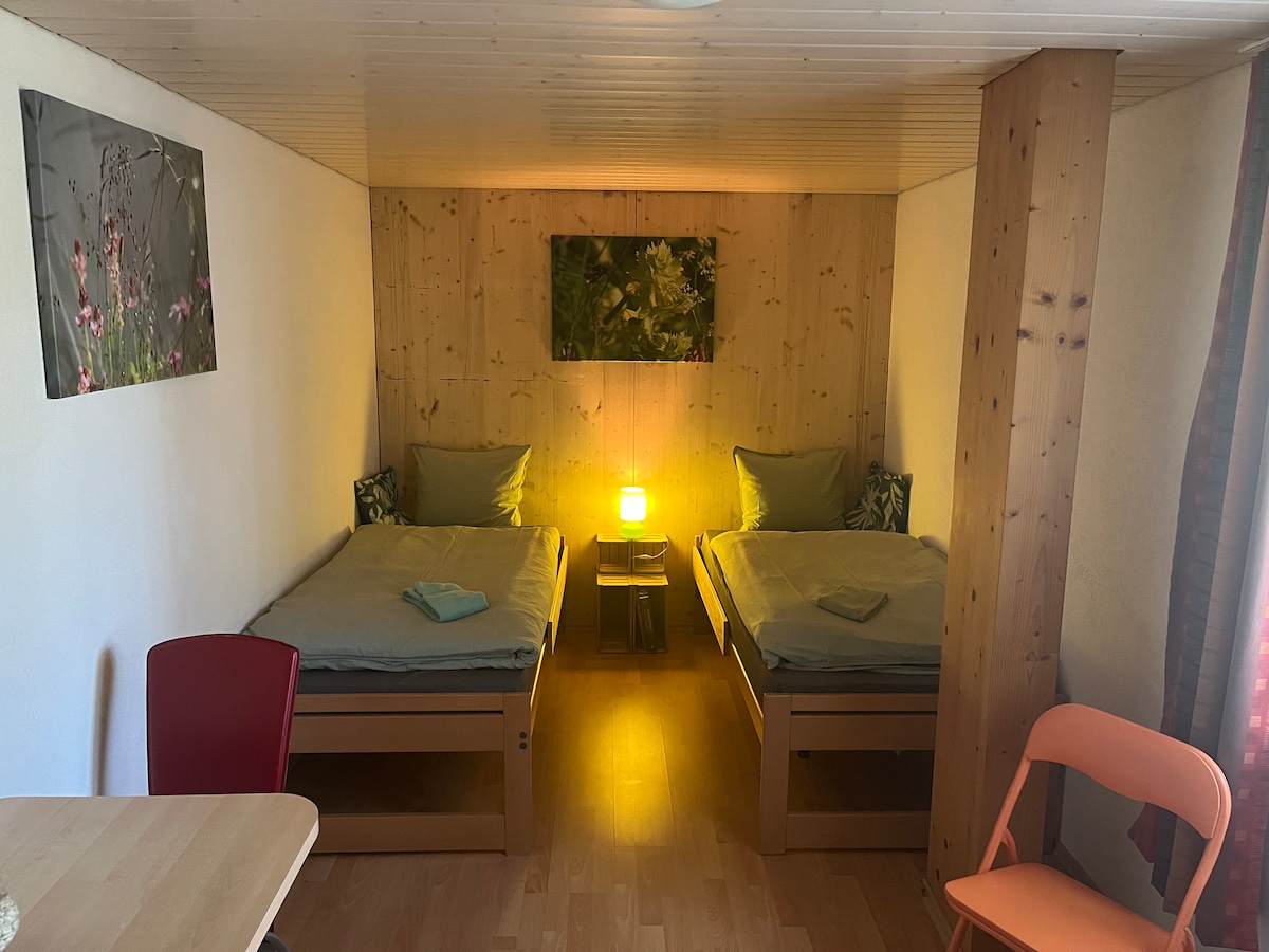 Wohnung mit nostalgischem Charme für 2 Personen in ländlicher Umgebung [2025 teilrenoviert]. Kostenloser Parkplatz direkt vor dem Haus. Idyllisch am Waldrand gelegen – ideal für Naturliebhaber. Wanderwege starten vor der Haustür. Die Wohnung verfügt über Schlafzimmer, Wohnzimmer, Küche sowie Dusche/WC. Aussensteckdose für Ladung E-Bikes. Einkaufsmöglichkeiten im Dorf ca 3km bis zum Dorfzentrum. Autobahnanschluss in alle Richtungen erreichbar in ca. 10 Minuten.