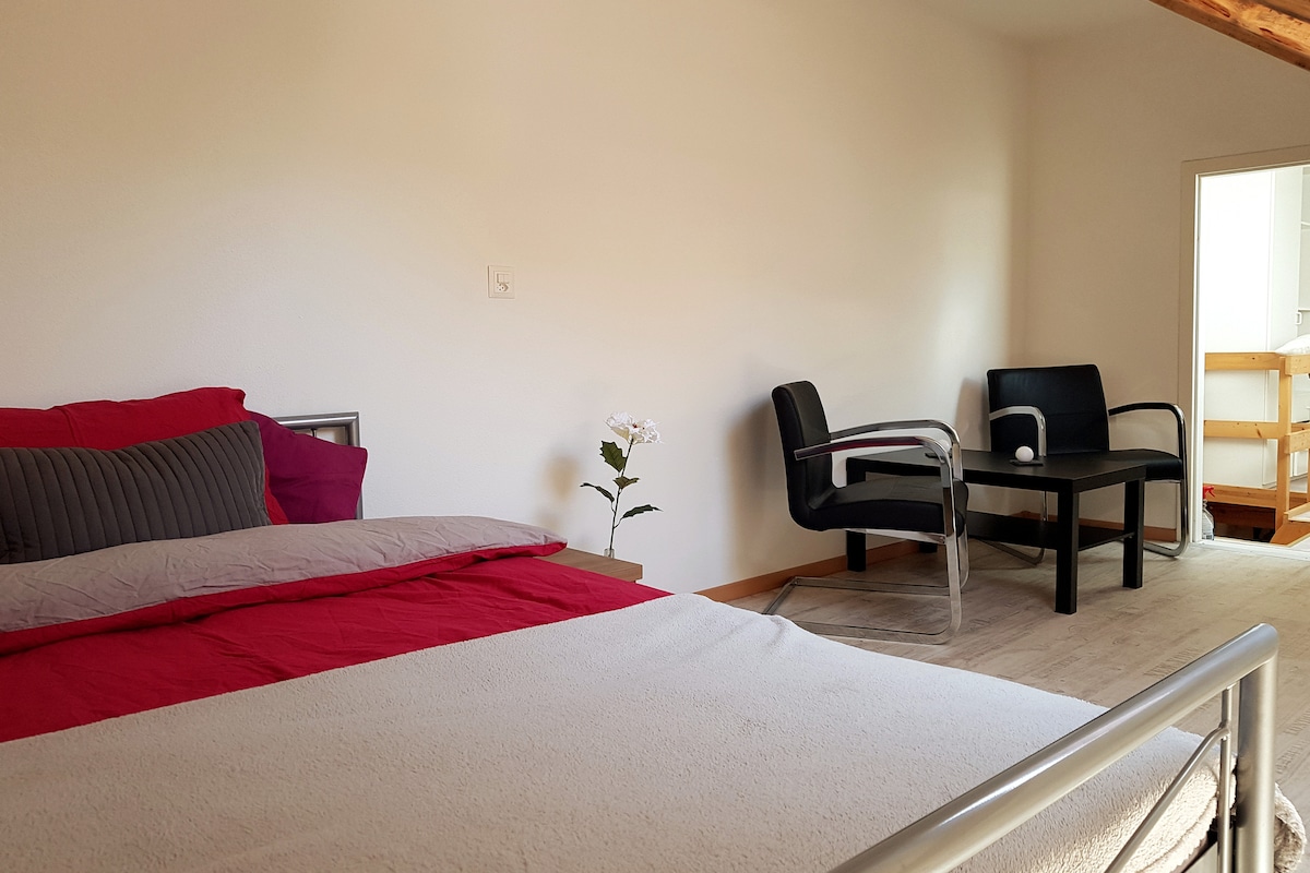 An idyllischer Lage befindet sich diese liebevoll renovierte Gäste-Wohnung mit viel schweizer Holz. Wir befinden uns nur 9' von der Autobahn A2 entfernt. Zürich, Luzern, Bern und Basel sind weniger als 60' entfernt. Hier kannst du fernab der Hektik ausspannen, Fahrrad fahren, wandern, bleibst aber zentral. Die Unterkunft hat einen separaten Eingang durchs Treppenhaus, ein eigenes Bad, ein sehr komfortables 180cm breites Doppelbett, eine tolle Aussicht und eine kleine Küchennische mit Essbereich.