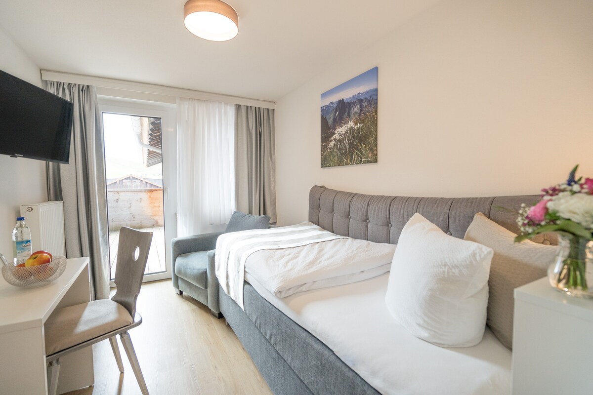 A stylish, modern alpine style room with double bed and single bed and an external bathroom with shower & toilet, this is located directly opposite the room. Equipped with TV & fast WiFi. Fluffy towels, power hairdryer, social toilet paper & soap from Allgäuer Werkstätten.