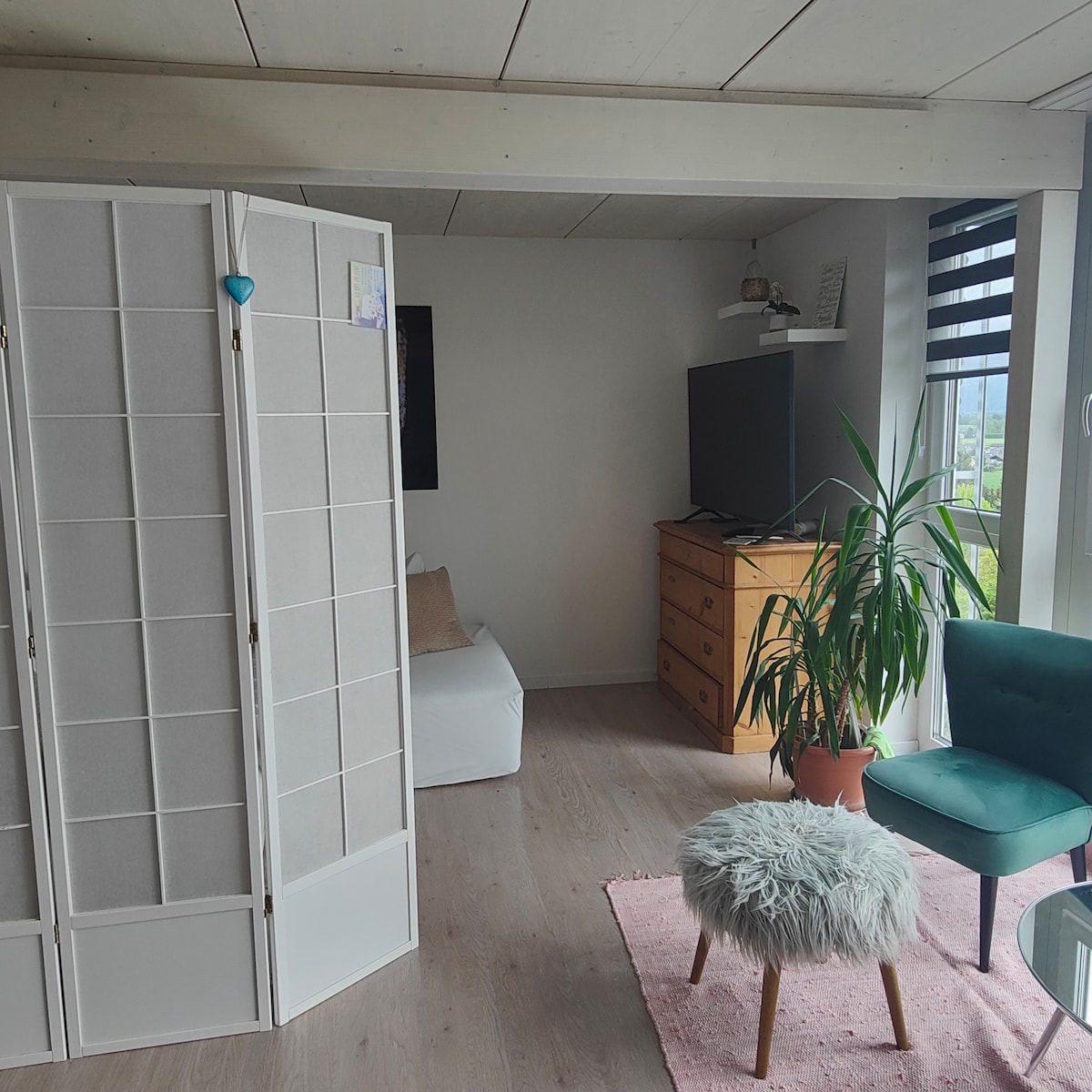 Helles Studio ist 22qm groß, mit einen separaten Eingang. Check in ist jederzeit nach 16:00möglich. Checkout bis 10:00. Das Studio besitzt ein Bett 140/200 (2 Pers.) plus ein Schlafsofa 140/200 (4 Pers.) inkl.doppel Duvet 220/200cm. Die Küche ist zum Kochen komplett ausgestattet inkl. Salz, Kräuter, Kaffee und Tee. Zum Studio gehört ein eigenes Badezimmer mit Dusche und WC inkl. Handtuch, Föhn, Duschgel & Shampoo. Vor dem Haus steht ein Parkplatz zur Verfügung . Tiere 15 CHF pro Tag
