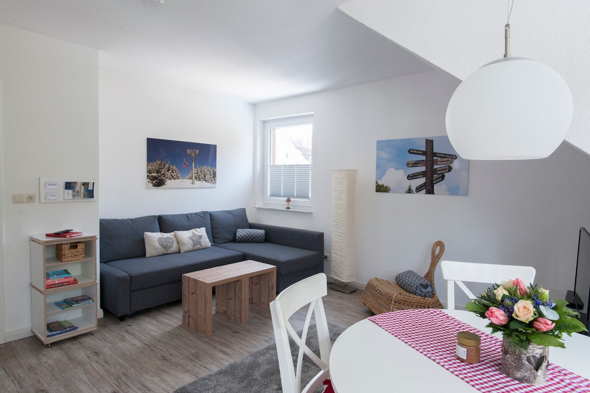Lust auf Aktiv-Urlaub im Harz? Mitten im Ort, gegenüber der Seilbahn, trotzdem ruhig liegt GLÜCKS-KLEE (60qm, 3 Balkone) und bietet Euch eine gemütliche Basis für entspannte Ferien, ist liebevoll und individuell ausgestattet. Die Wohnung hat ein geräumiges Wohn-Esszimmer, Schlafzimmer, gut ausgestattete Küche, Bad und 2 Balkone (West/Ost) im 1. Stk. Der 2. kleine Schlafraum liegt SEPARAT im DG mit eigenem WC und Balkon. Mit PKW-/Motorrad-Stellplatz sowie Ski- und Fahrradkeller 2019 renoviert