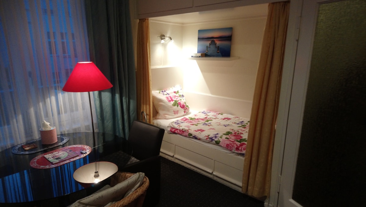 Großer Abgeschlossener Wohnbereich (1 Raum mit Badezimmer) in einem Einfamilienhaus im 1. Obergeschoss, mit Badezimmer, Küchenbereich und großer Terrasse. Das Appartement verfügt über einen eigenen Eingang und ist ca. 60 m ² groß. Zur Unterkunft gelangt man über einen schönen Garten. Das Haus befindet sich in einer ruhigen Nebenstraße. Parkplätze sind in der Regel auf der Straße vorhanden. Im Notfall in der Nachbarstraße mit kurzem Fußweg.