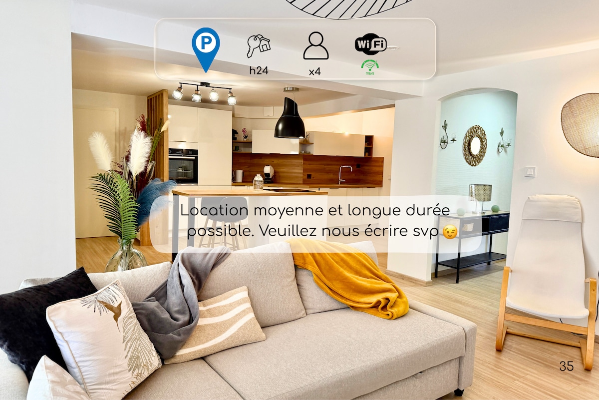 Charmant deux pièces de 55 m2 situé dans le centre historique de Strasbourg, à 50 mètres de la place de la Cathédrale. Logement classé 3 étoiles. Grand salon avec canapé convertible, cuisine ouverte entièrement équipée, grande chambre avec placards intégrés, poutres apparentes. Au 4è étage avec ascenseur, l'appartement est placé entre le Parking Gutenberg (100 m) et la rue des Orfèvres, nombreux commerces et restaurants à proximité immédiate. Parking gratuit à 15 minutes a pied de l appartement