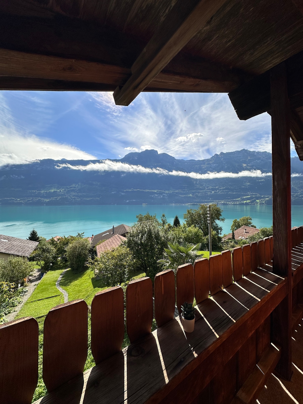 Unser Traditionelles Holz Chalet liegt am Südhang leicht erhöht über dem Brienzersee. Von der Ferienwohnung aus geniessen Sie einmalige, wunderschöne Aussicht über den grünblauen Brienzersee mit umliegenden Bergen! Die Wohnung liegt im Parterre und hat direkter Zugang zur Garten mit Terasse +See/Bergsicht Es sind 3Min zu Fuss zum Seeufer. GRATIS PARKPLATZ direkt neben dem Haus. Viele Sportliche-Ausflugsmöglichkeiten in der Nähe. Trampoline ist nur für unsere Gäste. *Sehr beliebt für Homeoffice*