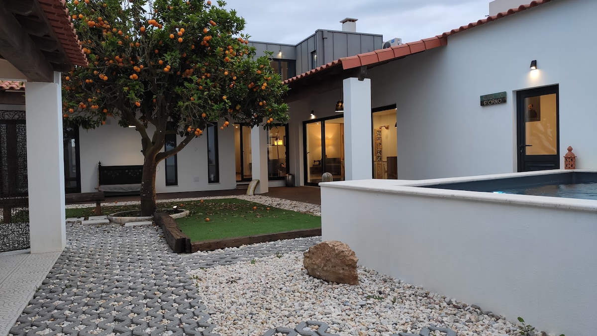 She never got tired of the peacefulness, the morning yoga in the garden, long pool dips under the cloudless sky and the calmness only nature can bring.. Brand new exclusive villa with bigger heated pool, located in the idyllic countryside overlooking the apple valleys of Alcobaça. Open space kitchen/living room with direct access to the pool area, equipped with loungers, dining area and BBQ. Enjoy a day at the beach, come home to a BBQ dinner and a sunset dip in the warm illuminated pool.