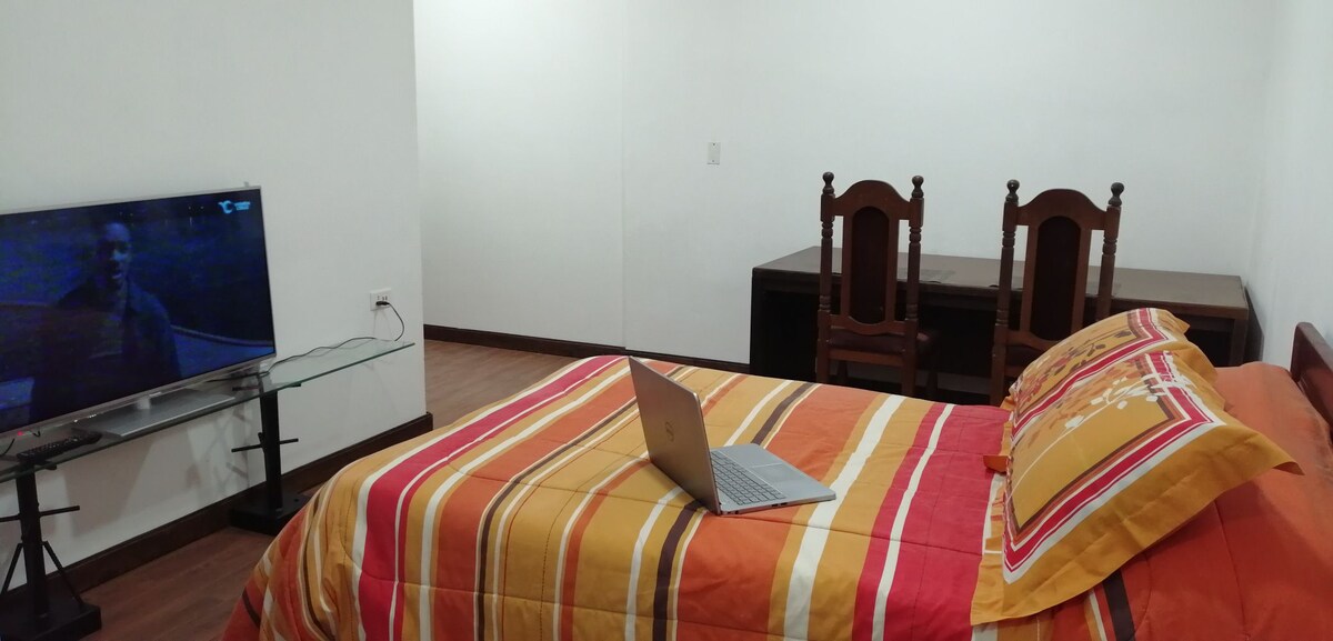 Disfrutá de una experiencia con estilo en este alojamiento céntrico. Ubicado a metros de la Plaza principal, café, restaurante, bancos, farmacia, supermercado, servicios varios. Disfruta de un ambiente pensado para tu comodidad: amplio, funcional,.... equipado con un baño de diseño moderno, WiFi, smart tv, refrigerador y un mesón con su respectiva vajilla.