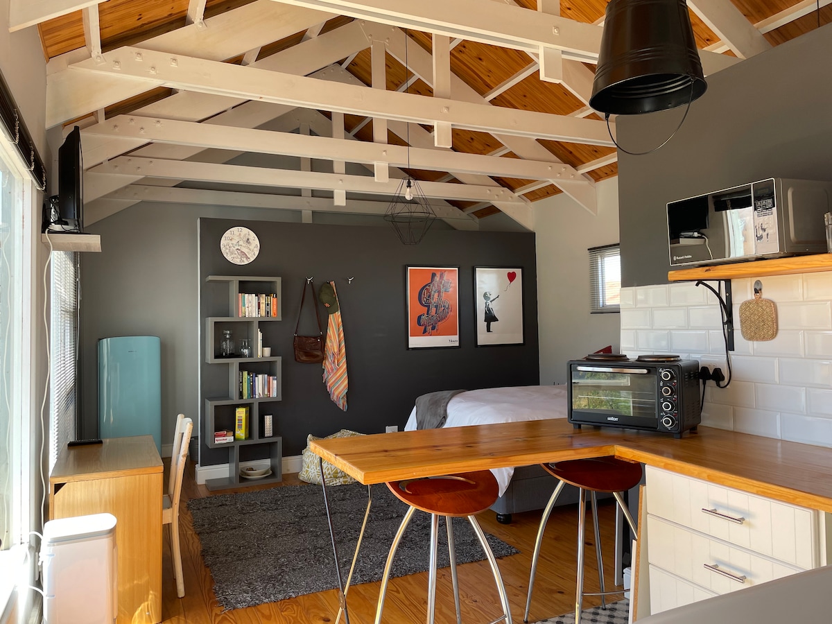 Our studio apartment opens up onto a 40sq meter balcony with a panoramic view of the Hout Bay Valley and the Helderberg mountains beyond. Large sliding doors disappear into the walls creating an unimpeded indoor/outdoor flow while the elevated position protects your privacy. The open plan bathroom faces onto an enclosed secret garden which includes a frame-less glass shower. The unit has a fully equipped kitchenette and is serviced daily except weekends and public holidays.