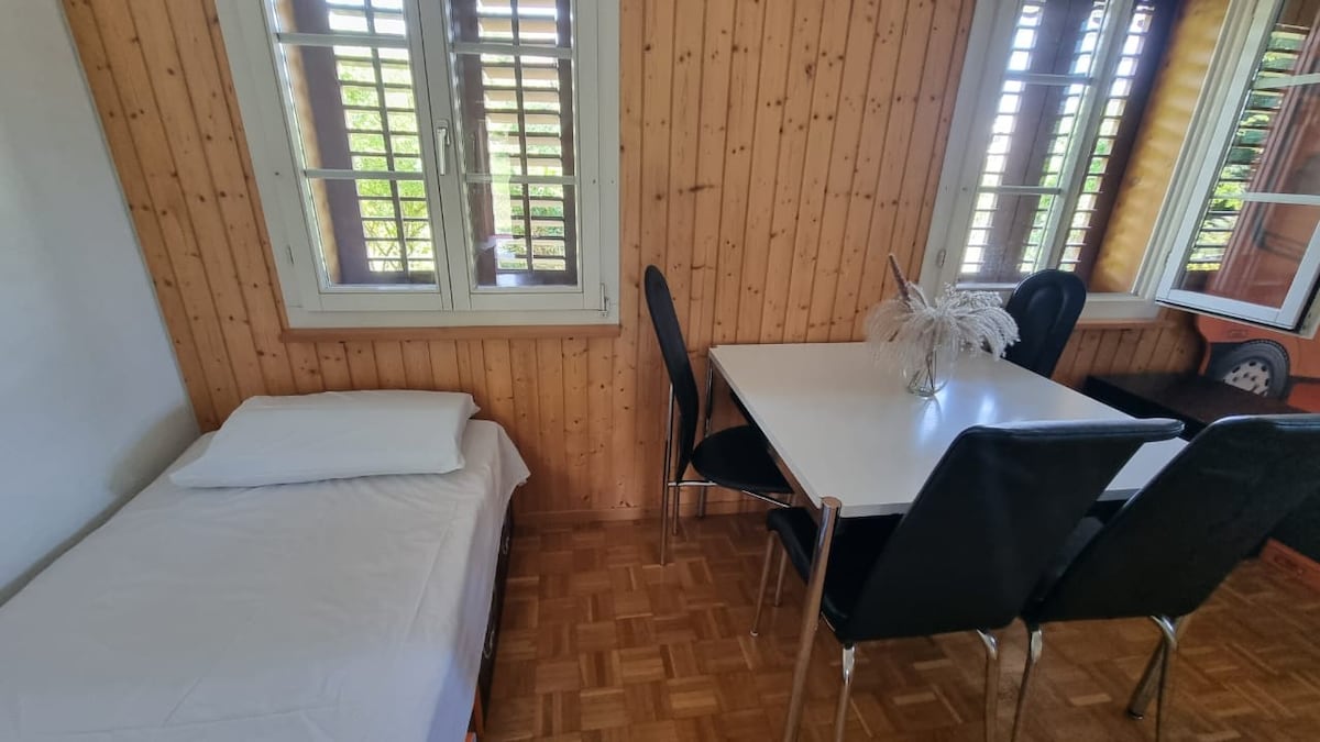Turm Zimmer am Fusse vom Pilatus. Einfach, klein, aber mit liebevolle Einrichtung. Wohn-/Schlafzimmer, Bad und Küche in einem Raum. Im Mietpreis ist auch ein kleines Frühstück. Tost, Schokoladenaufstrich, Butter, Milch, Tee, Schokoladenpulver 5 Minuten zur Bushaltestelle, 10 Minuten Luzern Zentrum/Bahnhof. 10 Minuten zu Einkaufszentrum oder zum See, guter Anschluss zu Autobahn. Für 1 bis maximal 2 Personen. Für ein zusätzliche Kind /bett ist die Wohnung zu klein, eine Buchung ist nicht möglich.